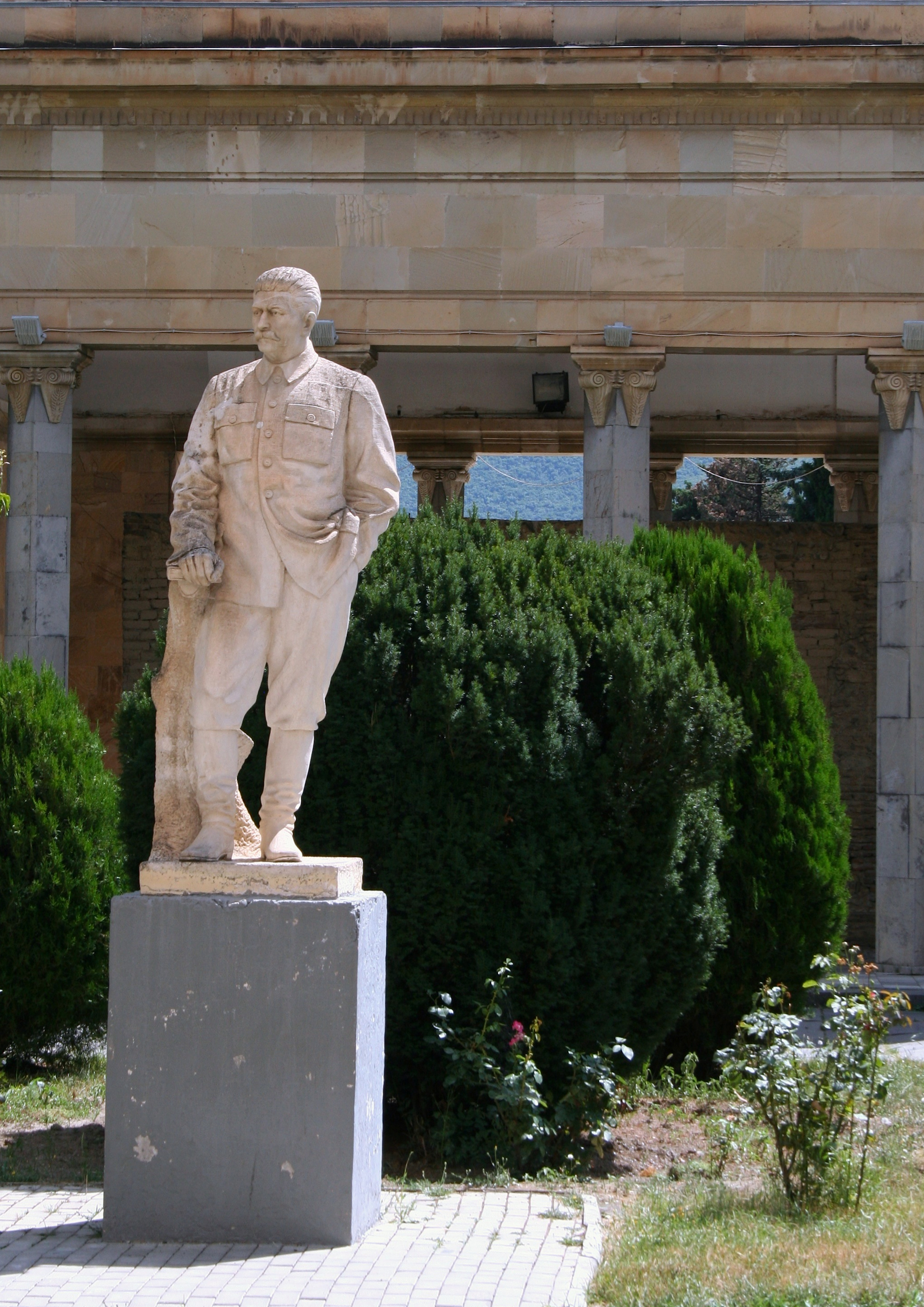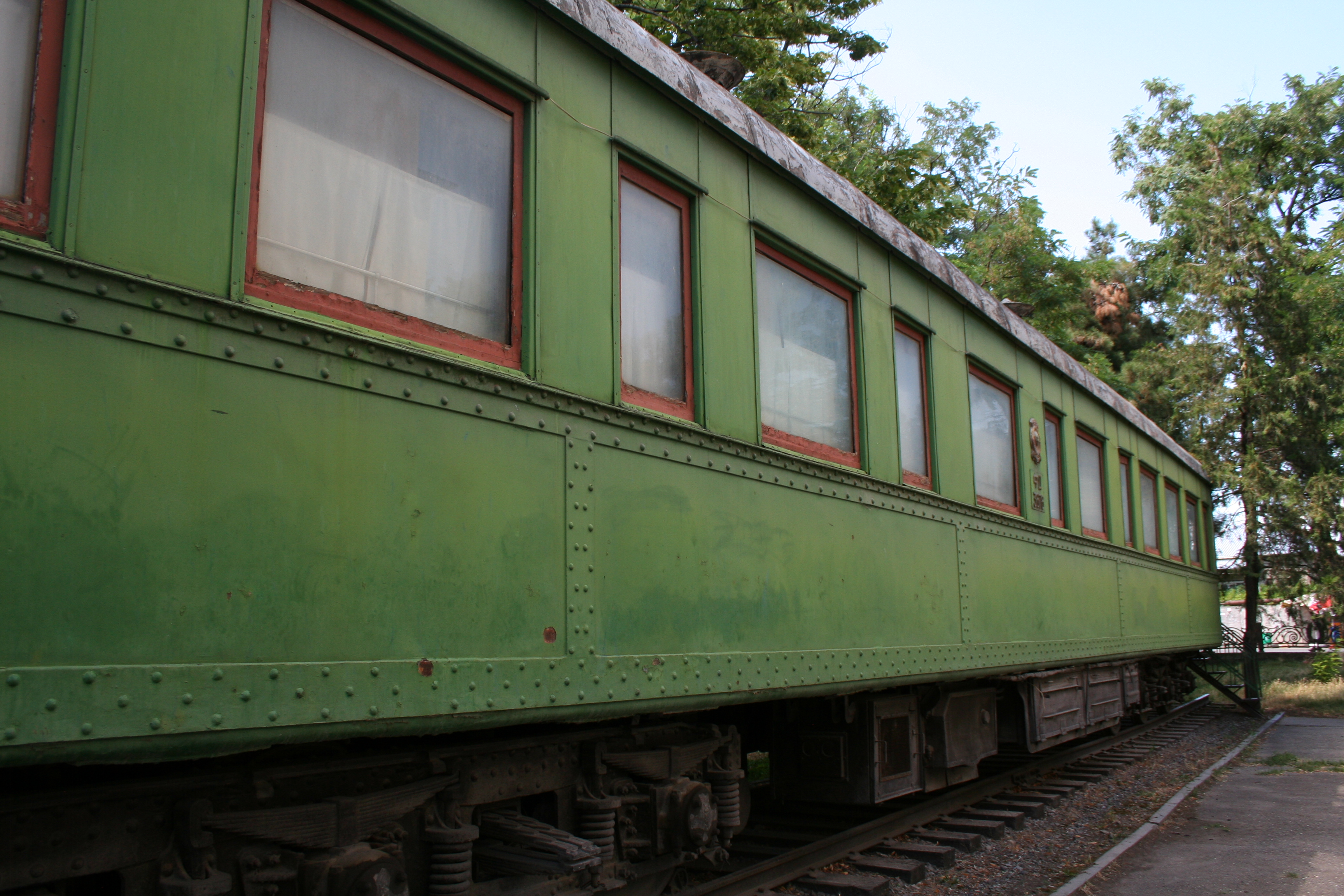 Around the corner form the home, and nestled under a nice shaded area is the train car Stalin took to the Yalta Conference where he sat as one of the “Big Three.” The train is an asparagus green, peeling and rusting around its edges. While the car is not as physically imposing as the museum, or even the structure covering his house, it’s weathered outside made it seem more real, more intimidating. Despite the fact that it was a hot and sunny day, the train seemed like it should have been sitting in a midnight sun surrounded by deep snow. There were no placards or signs, just the carriage on a disconnected rail. Inside, the amenities were nice, and not as fear evoking. The asparagus green carried over into the wallpaper. Back outside, it sank in that the decaying nature of the car gave it a sense of life and age. That sense of life is how it seemed to hold memories stronger than the better-tended areas of the museum.