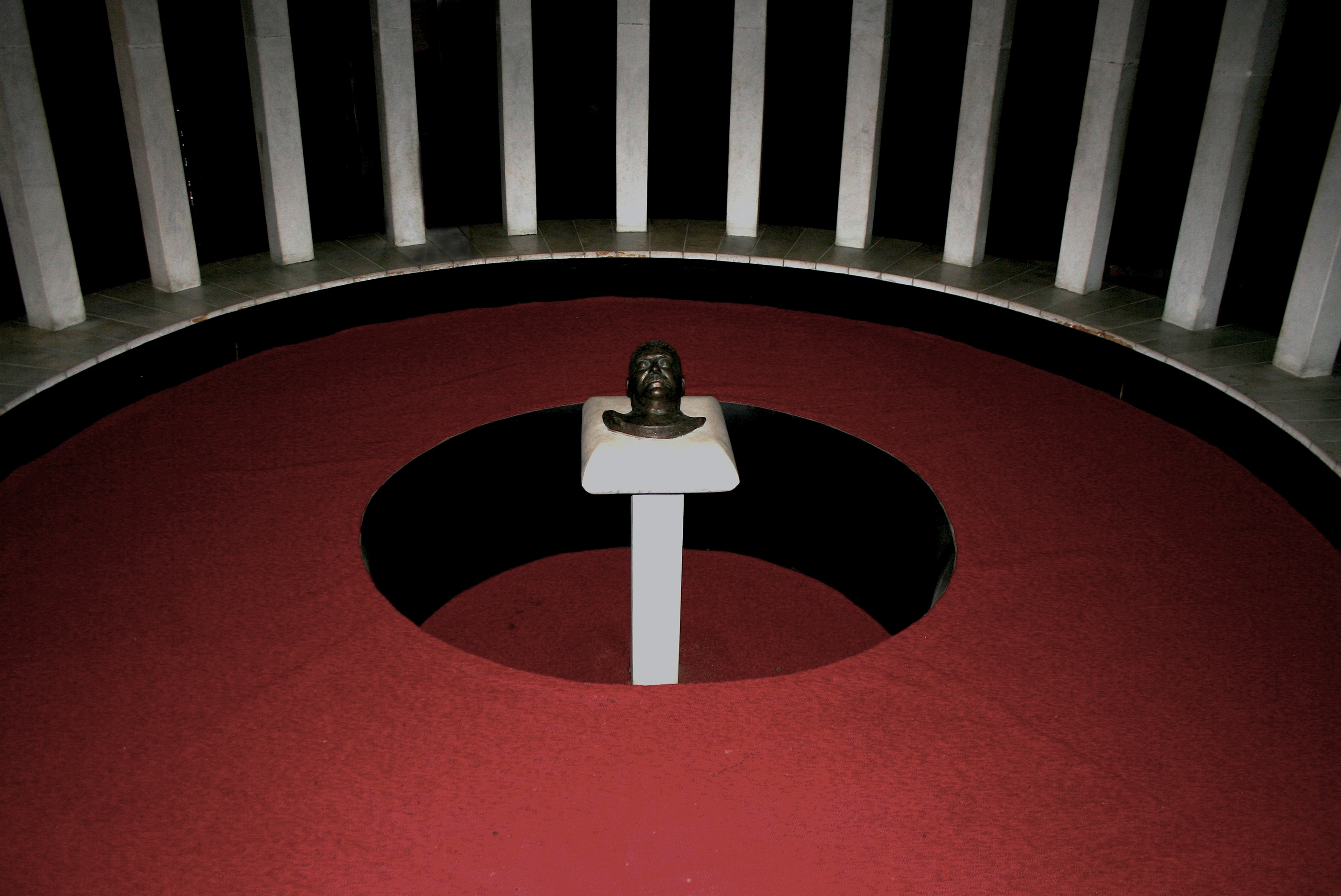 A guided tour, included in the admission, scurries through a half dozen rooms that begin at Stalin’s early life in Georgia. Each room contains a variety of photographs and documents that help to demonstrate the greatness that was Joseph. Artifacts are sprinkled about, most allegedly owned or used by Stalin, some more likely than others. A desk lamp supported by a tank that holds a radio. Coats. Hats. A sward. Cigars, and office furniture. Pictures of his son Yakov in a German concentration camp illustrate the love Stalin had for all his children of the USSR. Or so we are meant to believe through the associated story of his refusal to trade German prisoners for his own biological son, resulting in Yakov’s death. Following the rose-coloured walk through the life of Uncle Joe, we came to a large round room with red carpet and a smaller central circle of thick white square columns. In the middle of these bars, a bronze death mask of Stalin sat atop a short marble pedestal.