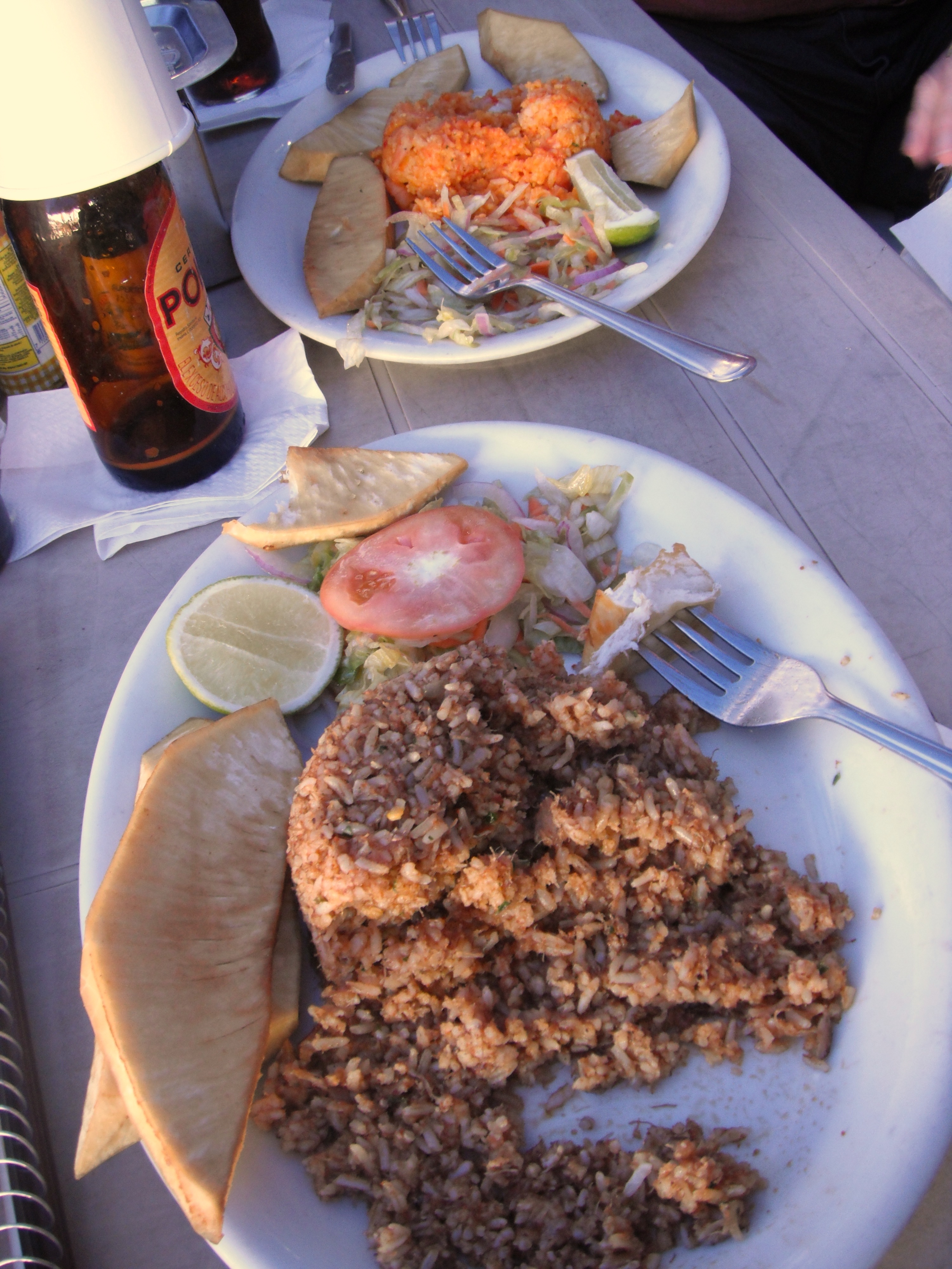 Our table at Fisherman’s Place was just under the airport’s one runway, and nestled into a sandy beach crowded with small fishing boats. It gave the impression of bustling and a little bit frantic. Boats were coming and going, fishermen were weighing their catch, paint was peeling from the kitchen’s external walls, and horizontal stress cracks were opening up on the building’s corners. The food was simple but memorable, and the crab rice with plantains currently sits in my top ten favourite dishes. Fresh lime squeezed across the plate cut through the hot and humid post rain air in which we had landed, and was a welcome cool bright retreat. Initial assumptions of chaos were unwarranted, and it was a rather slow relaxing place to sit between flights.